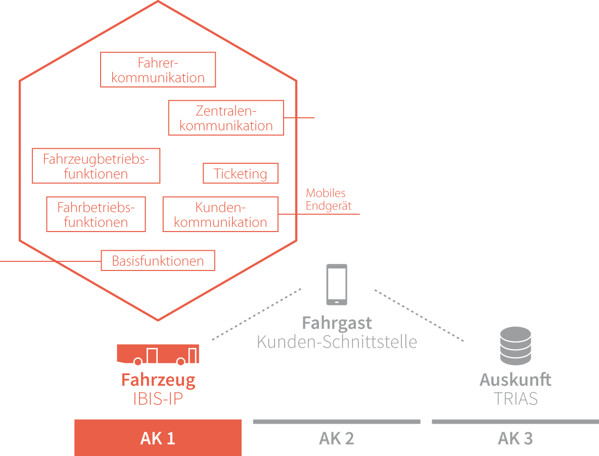 Ziele des AK1 waren die Spezifikation eines performanten IP-basierten Kommunikationsprotokolls im Fahrzeug (IBIS-IP) und der Nachweis von dessen Funktionsfähigkeit. Mit IBIS-IP wird man zum einen den gewachsenen Bedürfnissen der fahrzeuginternen Fahrgastinformation gerecht. Zum anderen wird eine neue Schnittstelle zu mobilen Kundenendgeräten bereitgestellt.