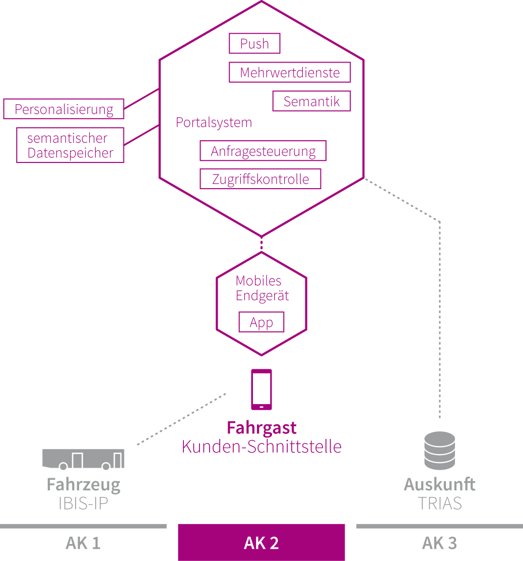 Der Arbeitskomplex 2 wurde durch die Juniorprofessur "Software Engineering ubiquitärer Systeme" geleitet und wissenschaftlich bearbeitet. In AK 2 stehen der Fahrgast und dessen Informationsbedarf im Fokus. Über definierte Schnittstellen erhalten die mobilen Geräte der Fahrgäste die notwendigen Informationen.